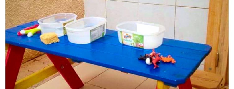 Pour contenir l’eau j’ai utilisé de vieilles boites de glaces qui ont l’avantage de ne pas casser et pour la vaisselle j’ai juste pris ses couverts en plastique : cuillères, fourchettes, couteaux. Ensuite une petite éponge et du savon liquide.