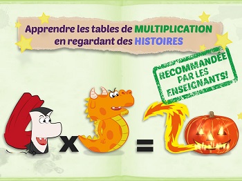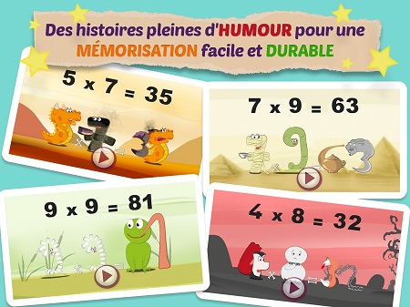 Module « J’apprends » : on choisit une table et on découvre ensuite toutes les histoires de cette table. A noter que la notion « d’astuce d’inversion » est présentée pour avoir moins d’opérations à mémoriser (2×4 = 4×2)